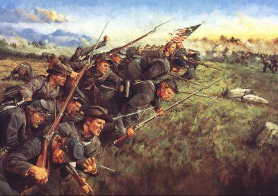 It’s self-sacrifice. And courage. And bravery. And genius. And pageantry. And heroism. The Keith Rocco print to the right here exemplifies this to me. It’s of the charge of the 1st Minnesota at Gettysburg on the Second Day. Chamberlain gets more press and attention, but without those 262 (47 answered roll the next day) men hurling themselves at 2,000 Confederates whowerethiscloseto piercing the Union line, maybe Gettysburg ends differently.*