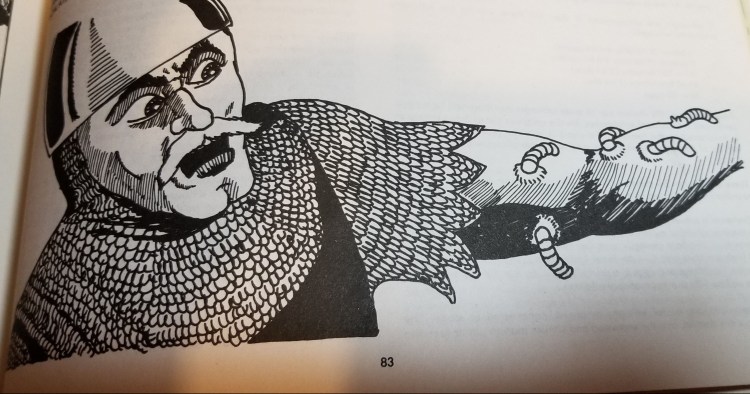 The first time I saw anything D&D related was either in a toy store (on Kirkman in Lake Charles, I think it’s a hardware store or something now) where I picked up the first Monster Manual and flipped through it. I have a vivid memory of the . . . shoot, grub worm or something which had a drawing of a fighter’s arm and a worm eating it’s way out of it.